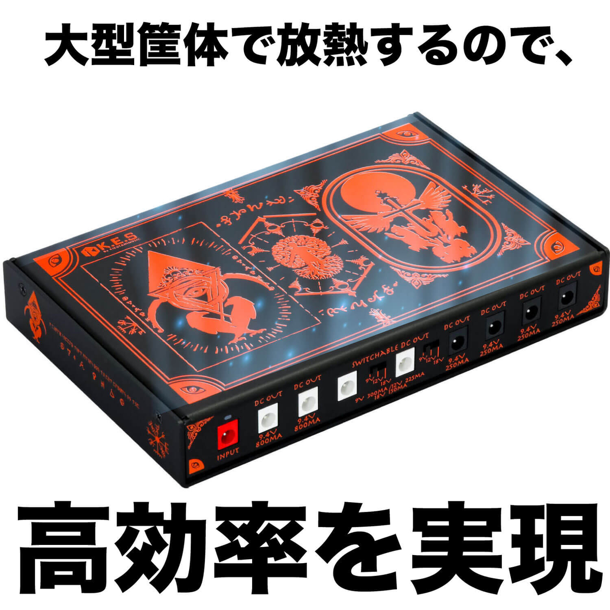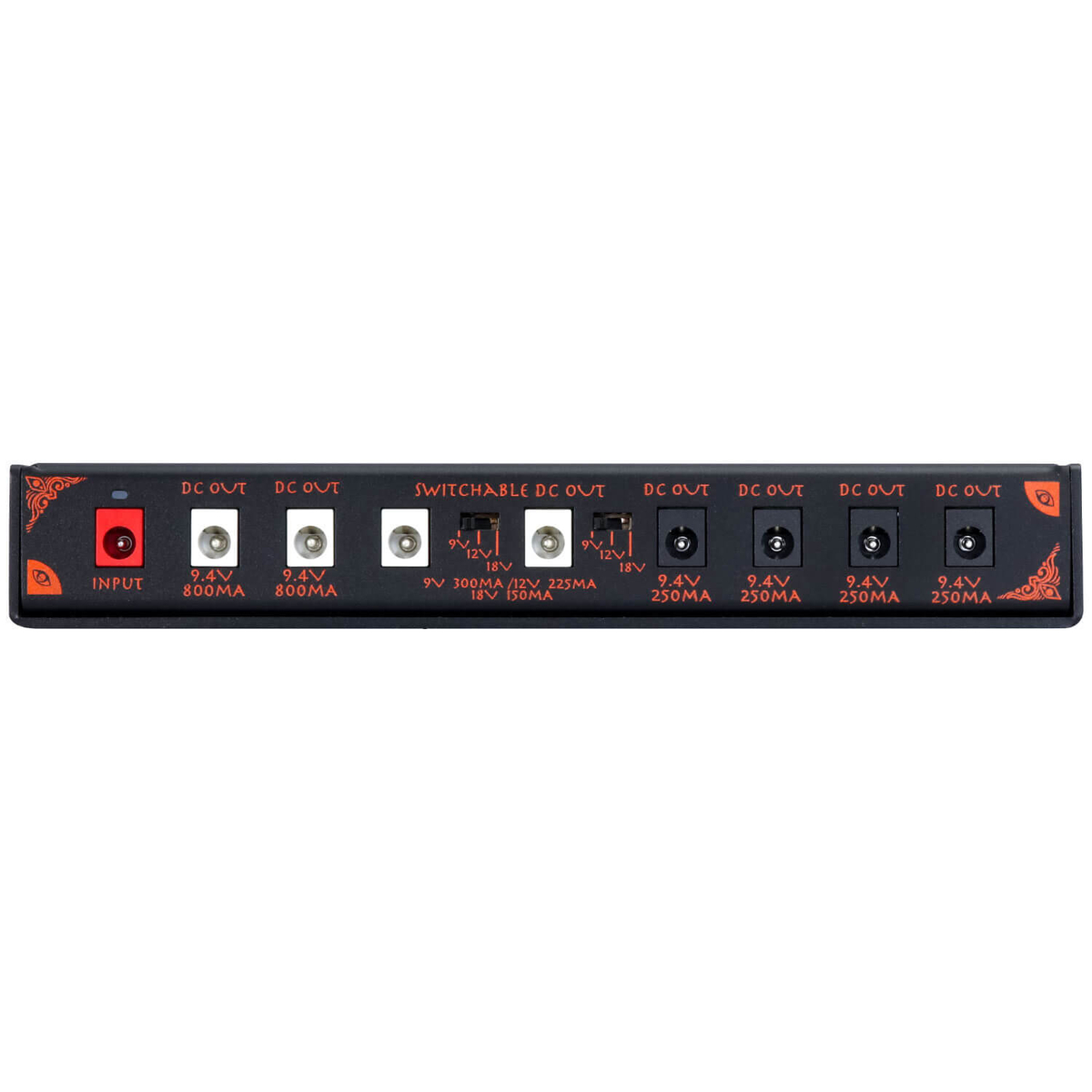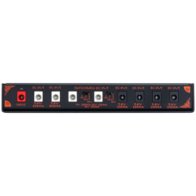 9.4Vの250mA出力を4系統・9.4Vの800mA出力のポートを2系統・9Vの500mA/12Vの375mA/18Vの250mAを切替可能なポートを2系統装備し、要求電圧の高電流ペダルや18V駆動の機種まで幅広くカバーします。